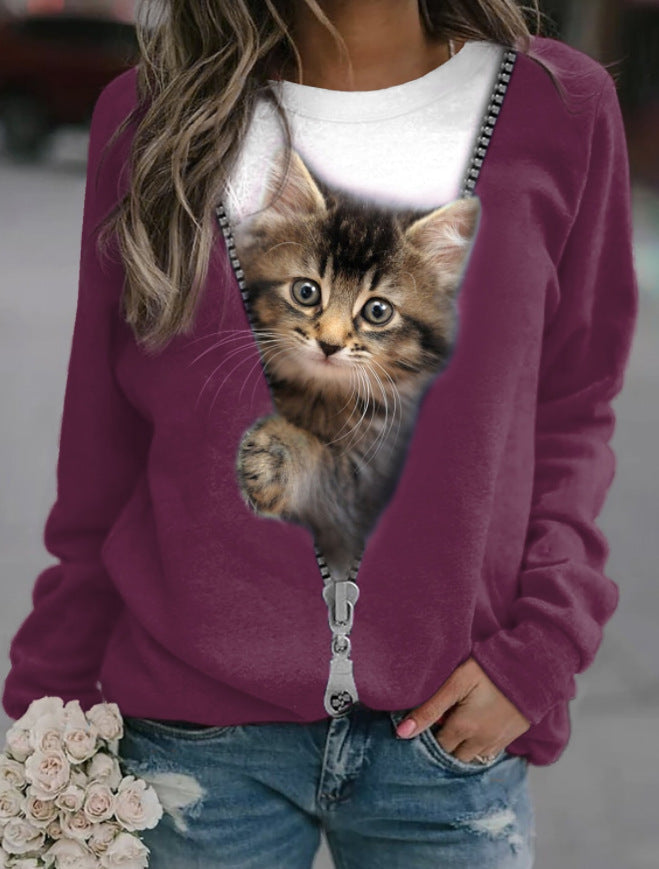 Women's Cat Basic Printed Round Neck Regular Pullover