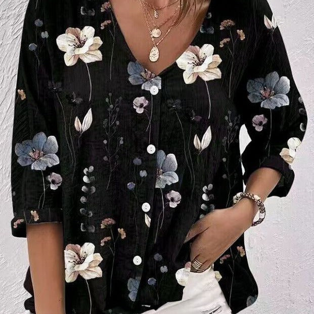Women's V-neck Button Chiffon Printed Cardigan Long Sleeved Shirt