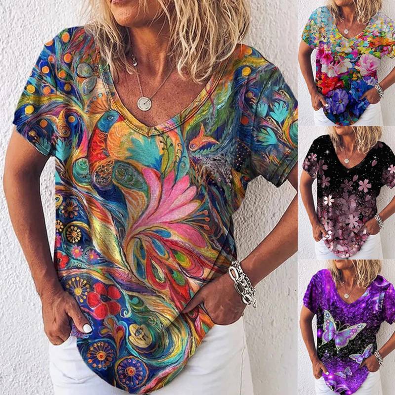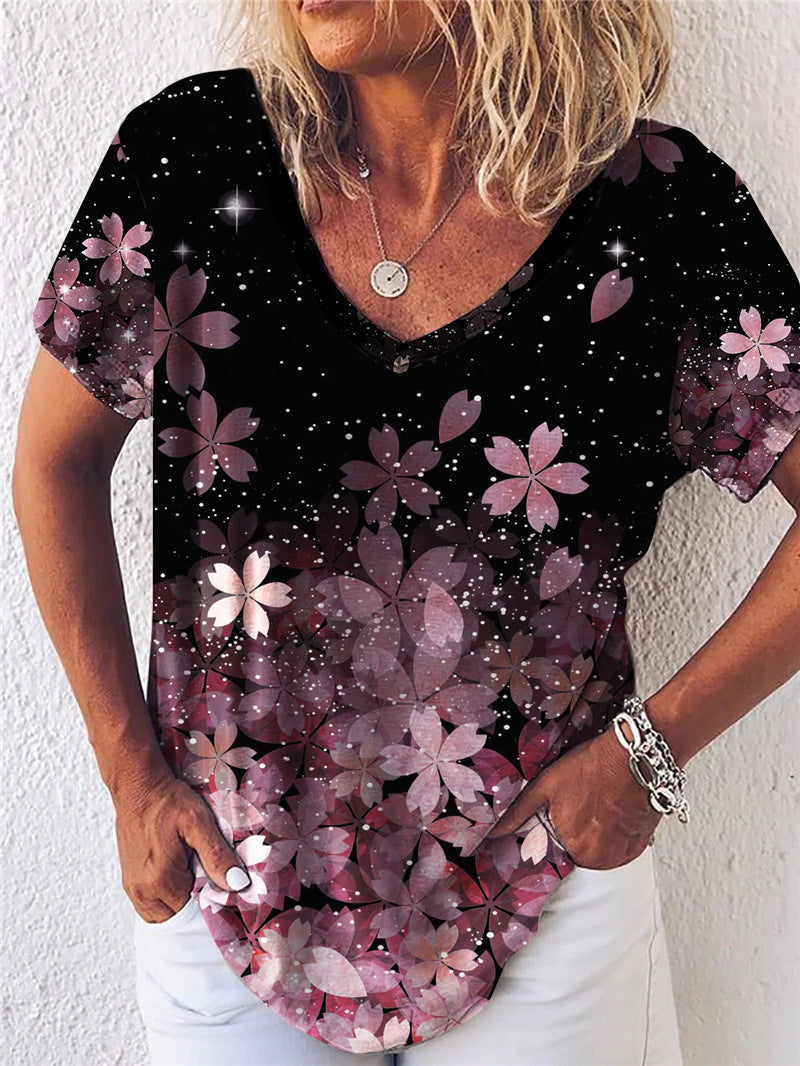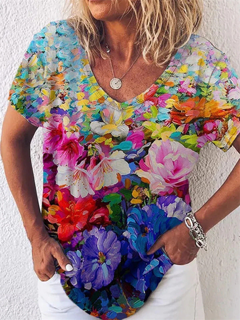 Summer Popular Floral Print Short-sleeved V-neck T-shirt For Women
