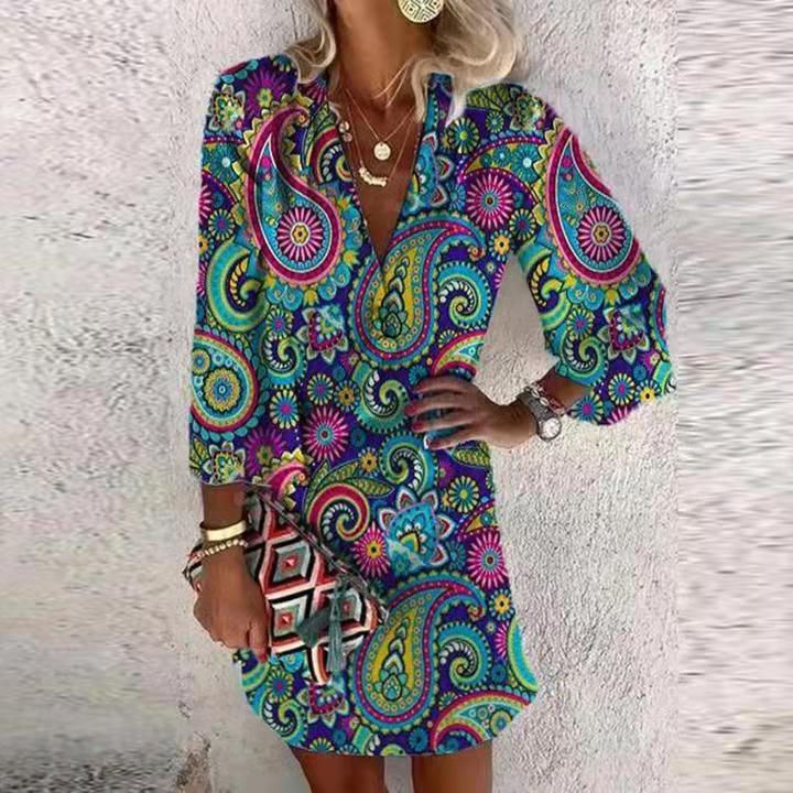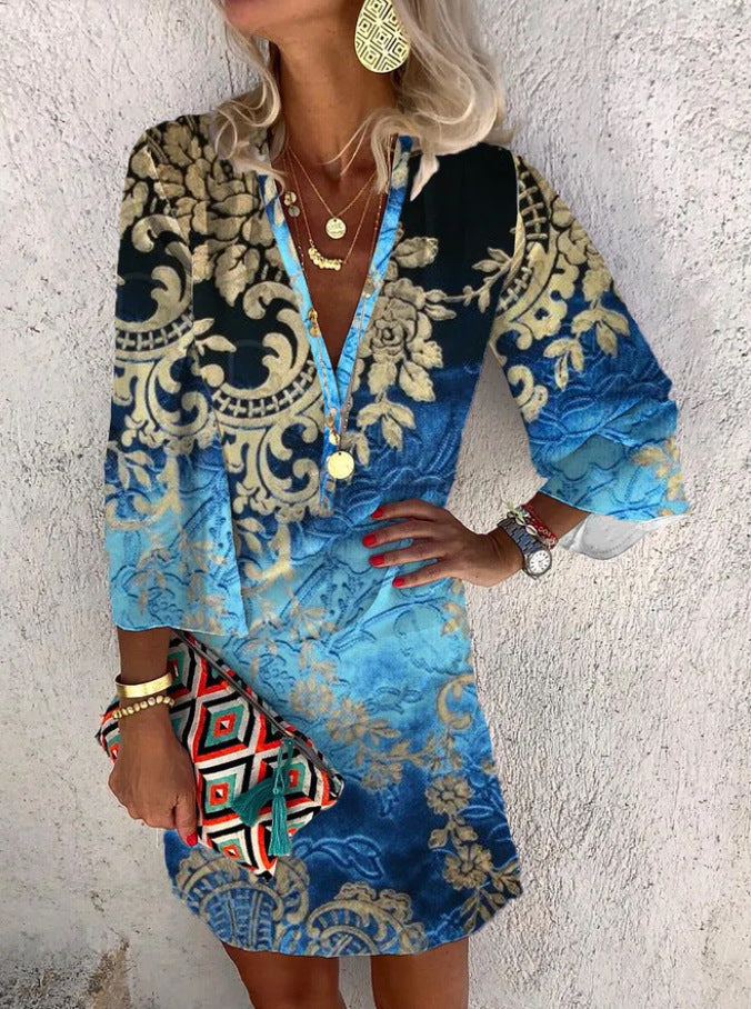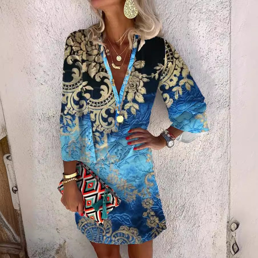 Summer V-neck Hanging Long Sleeve Printed Beach Bohemian Style Short Loose Dress Women