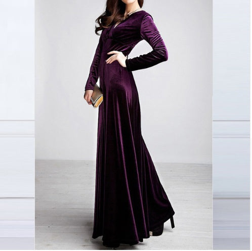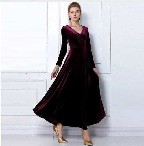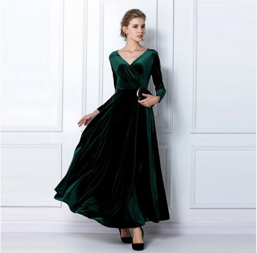 Thickened good quality Spring and autumn winter long-sleeved dress Gold velvet maxi dress V-neck dress
