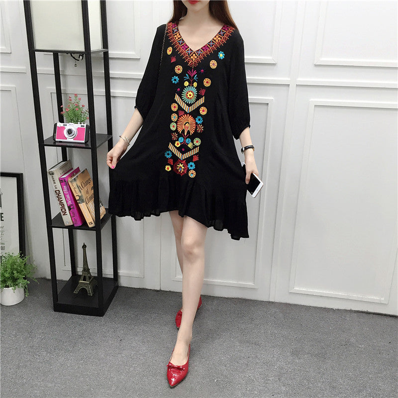 Thin Three-quarter Sleeves Cotton And Linen Mid-length Seaside Holiday Dress