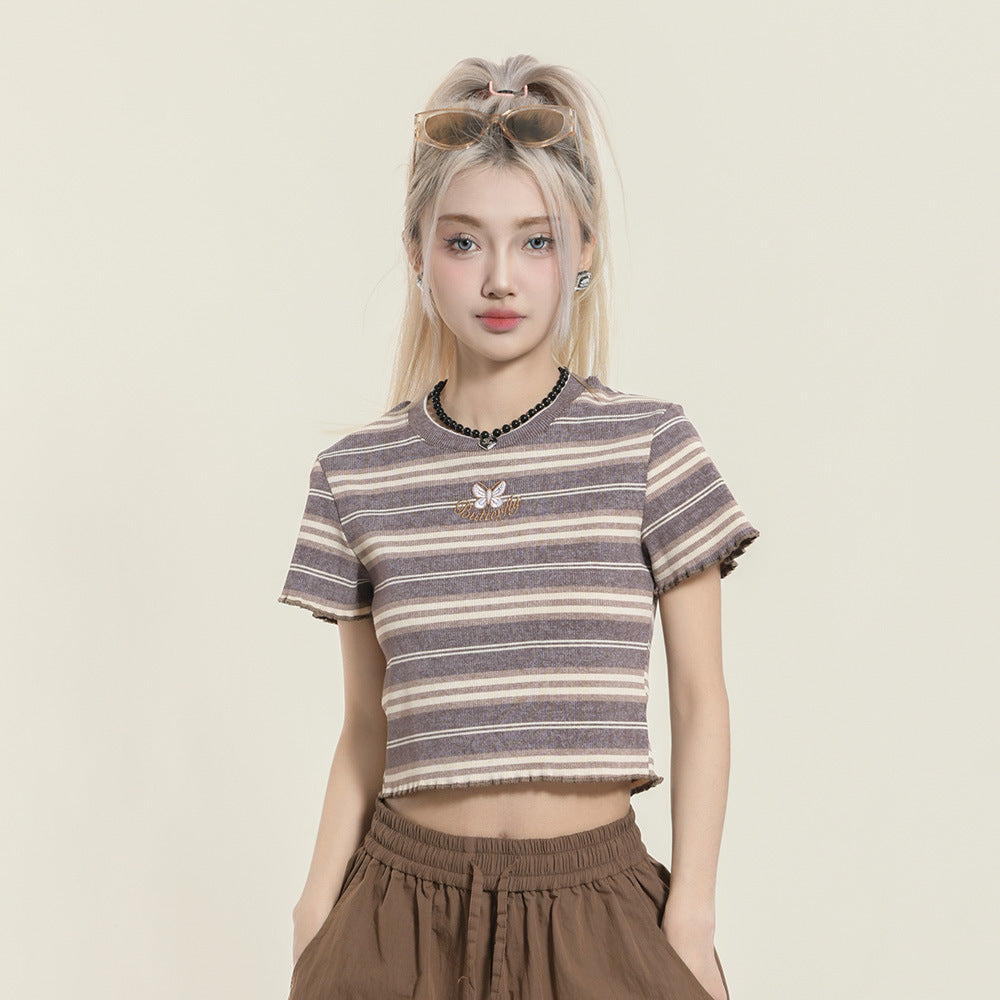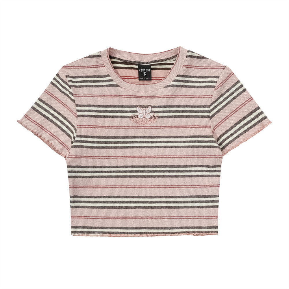 Contrast Color Striped Butterfly Embroidered Short Sleeve
