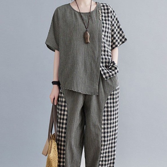 Regular price $27.33 USDSale price $27.33 USD Regular priceUnit price perSale Sold outProduct information: Pattern: stripes/Plaid Fabric name: cotton and linen Color: large plaid, small Plaid Sleeve type: batwing sleeve Pants length: cropped pants Main fabric composition: Cotton...