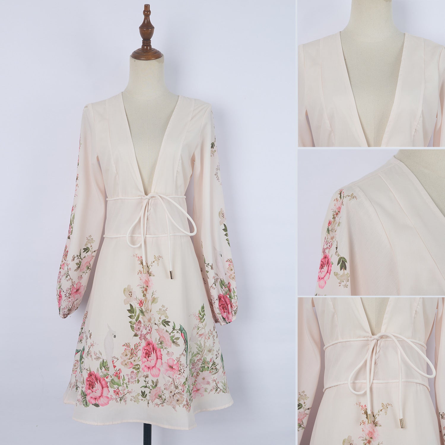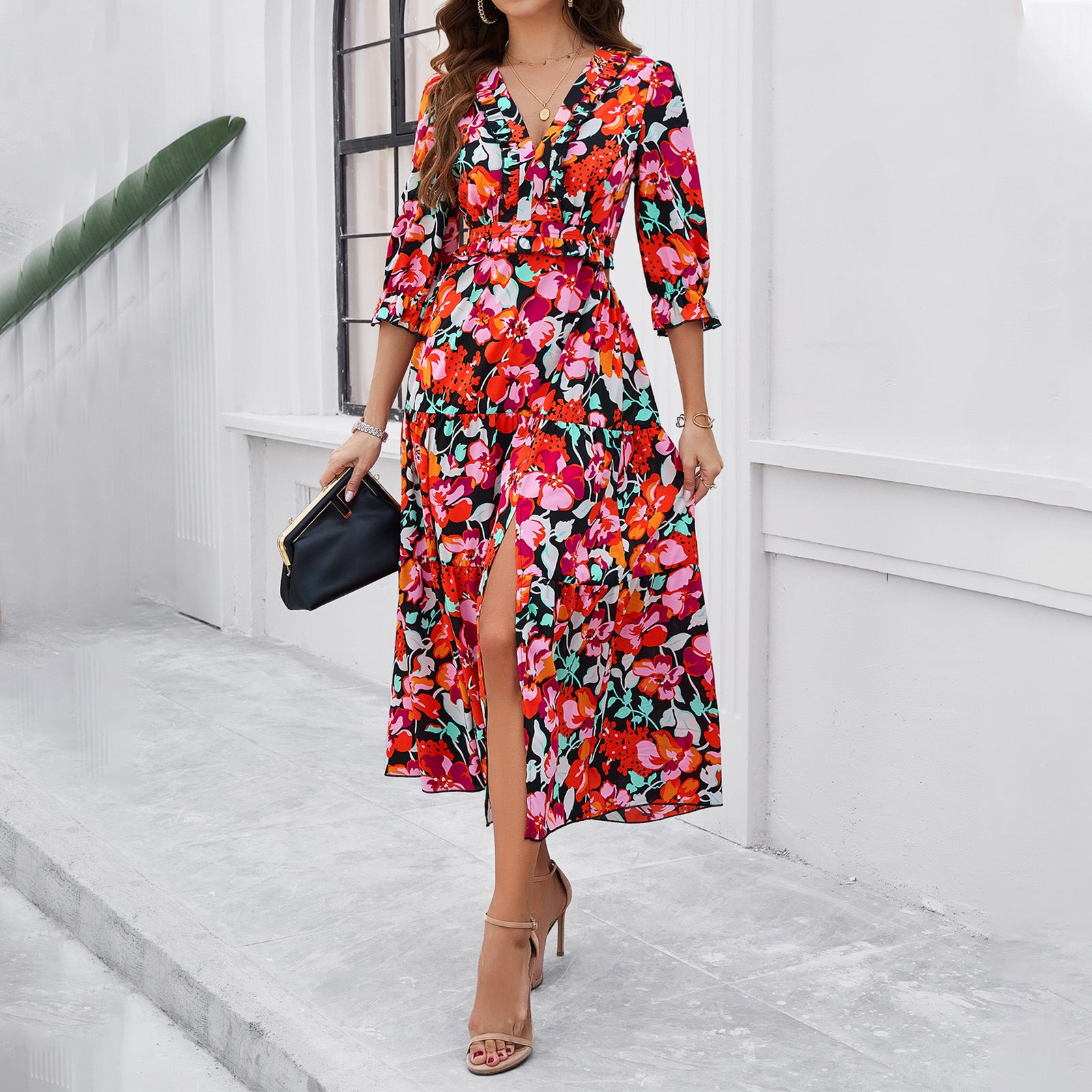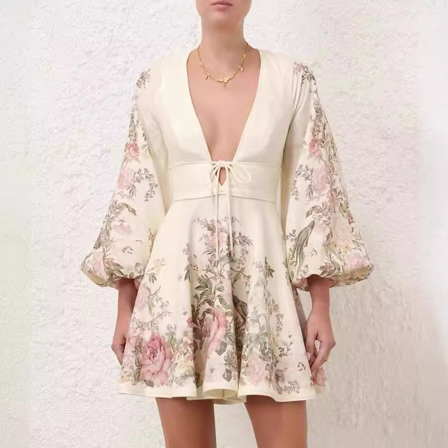 Spring And Summer V-neck Lantern Sleeve Positioning Printing Dress