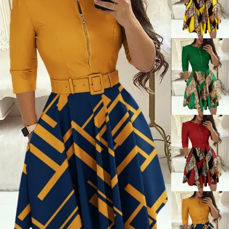 Style Waist Bag Hip Round Neck Sleeved Dress