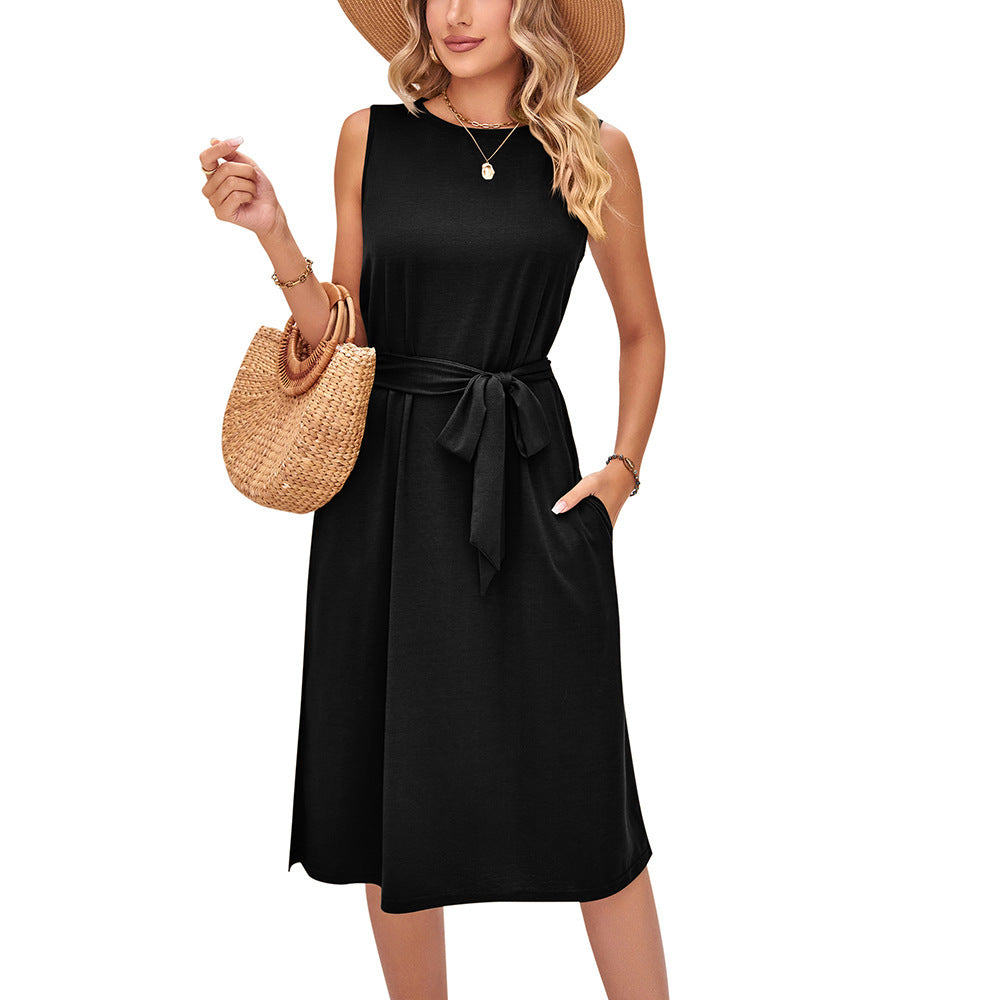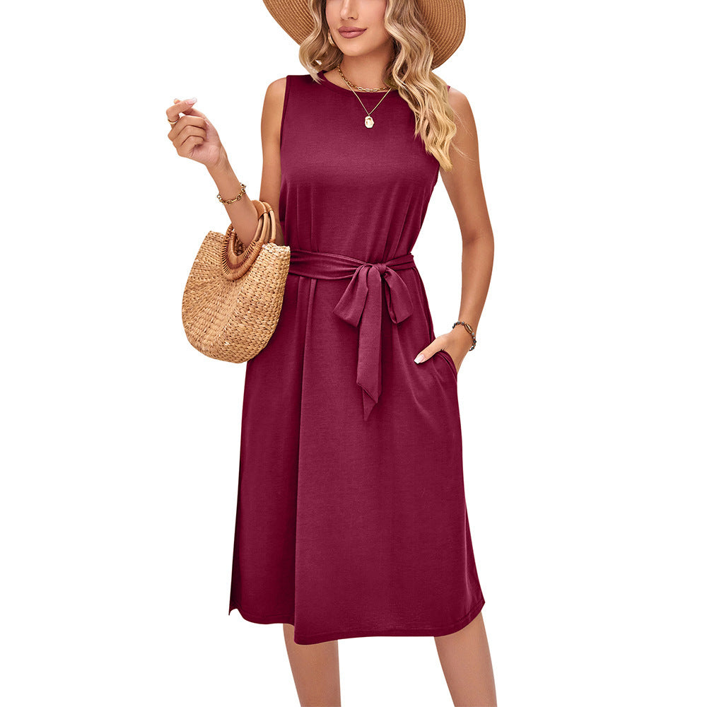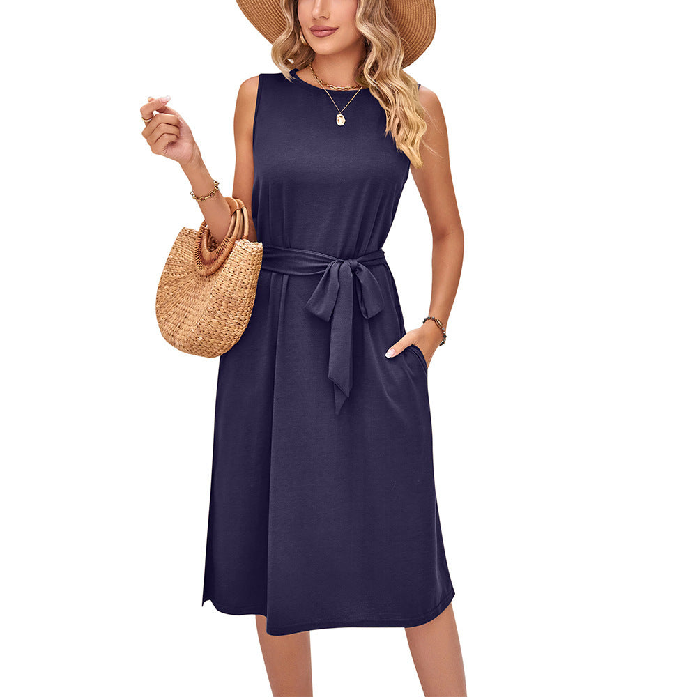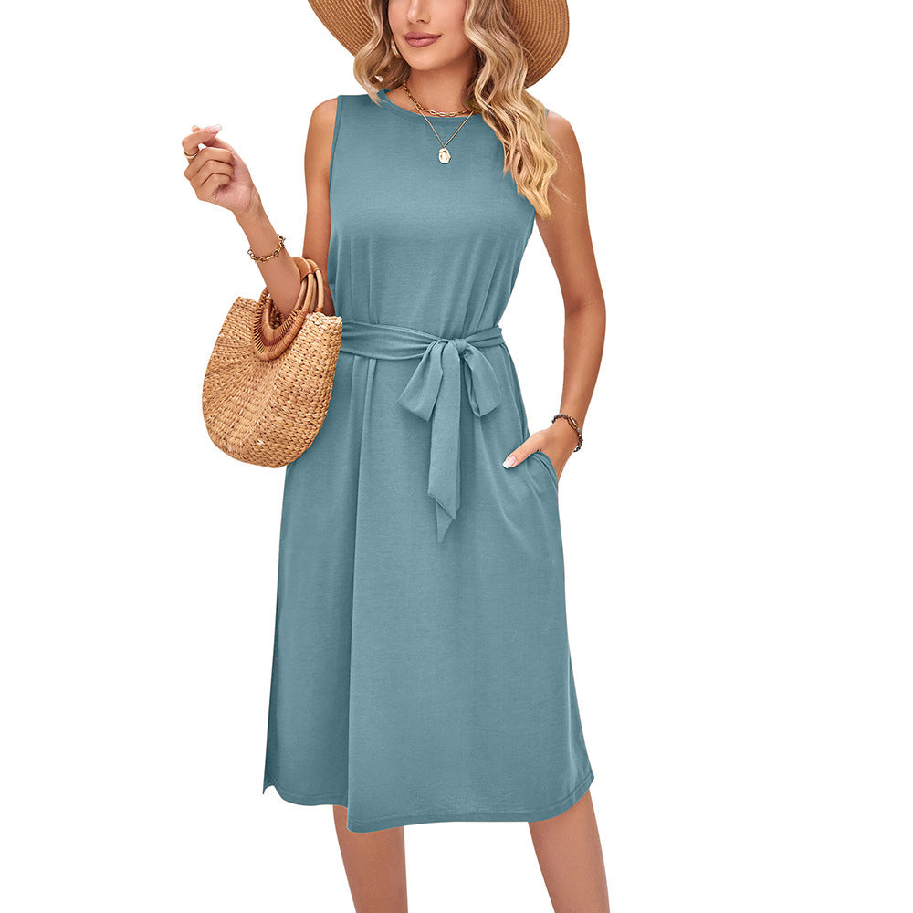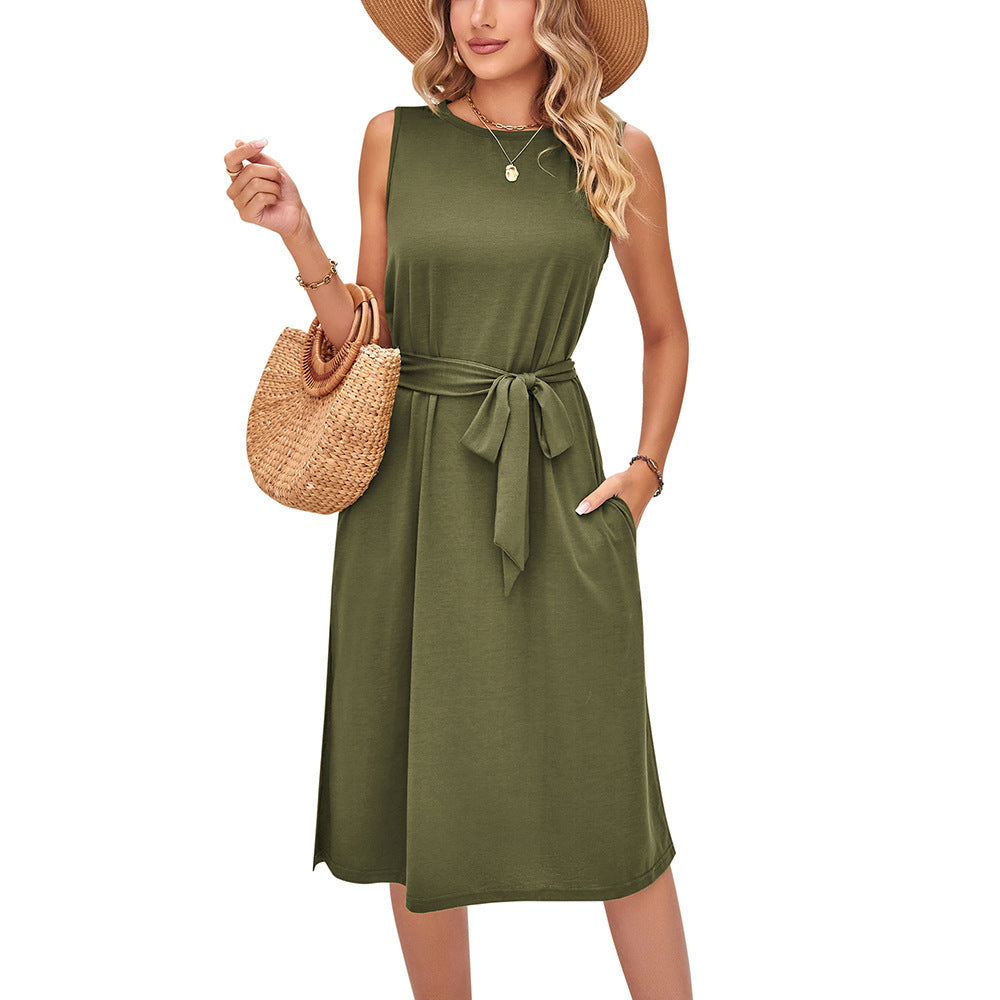 Summer Casual Sleeveless Vest Belt Midi Dress