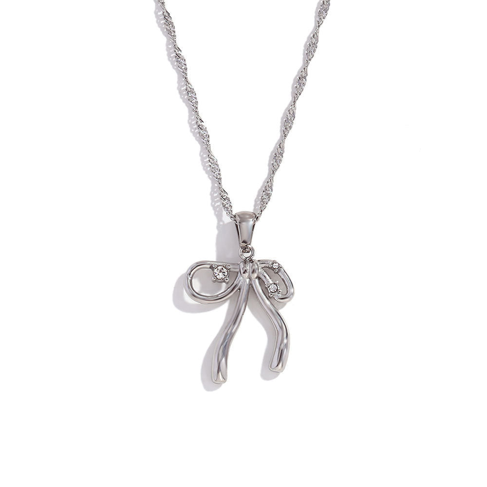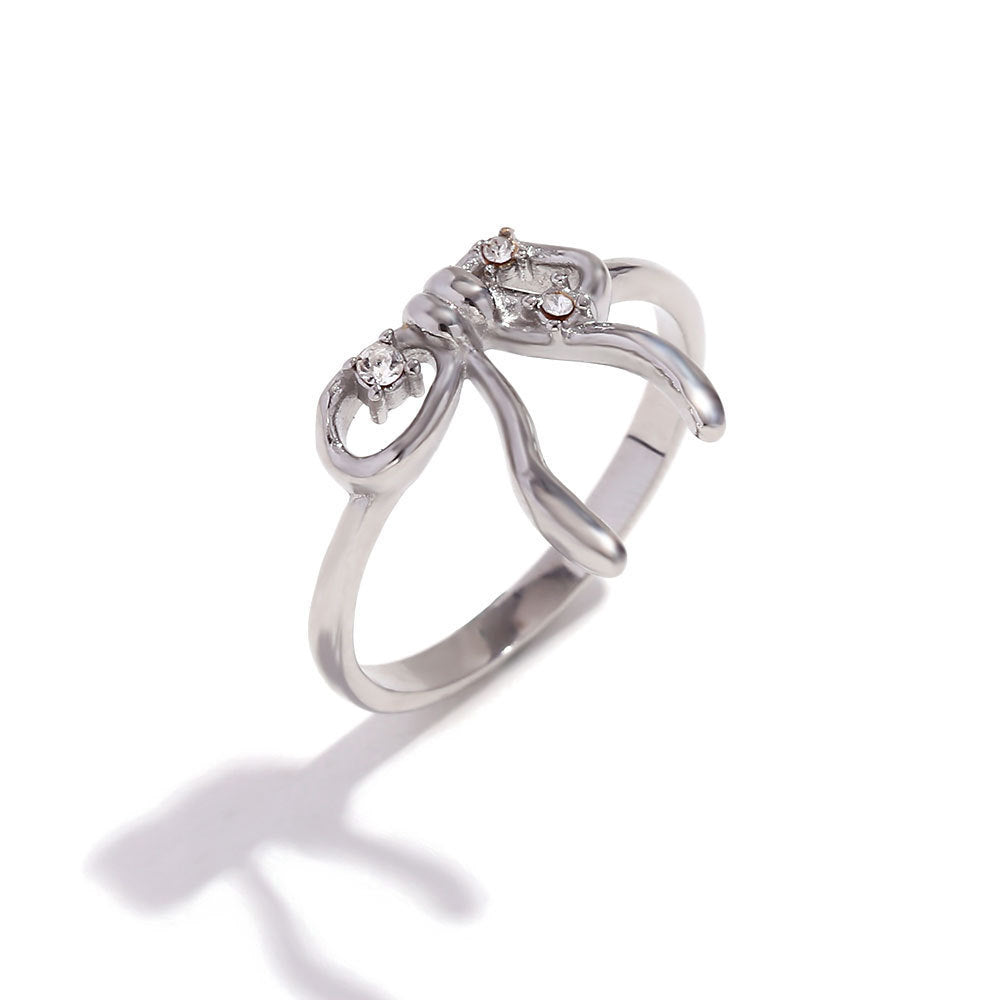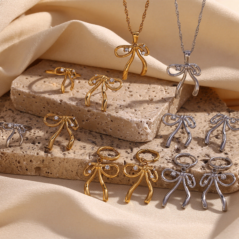 Creative Personality Necklace Stainless Steel 18K Gold Plating Sweet Rhinestone Bow Pendant Earring Ring