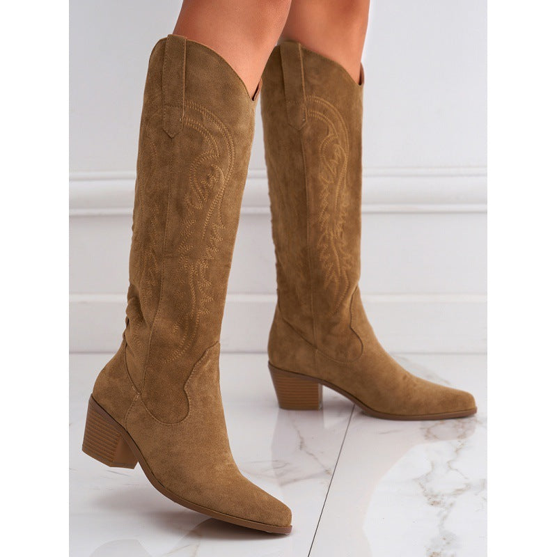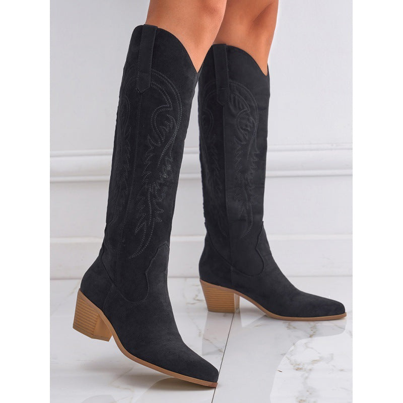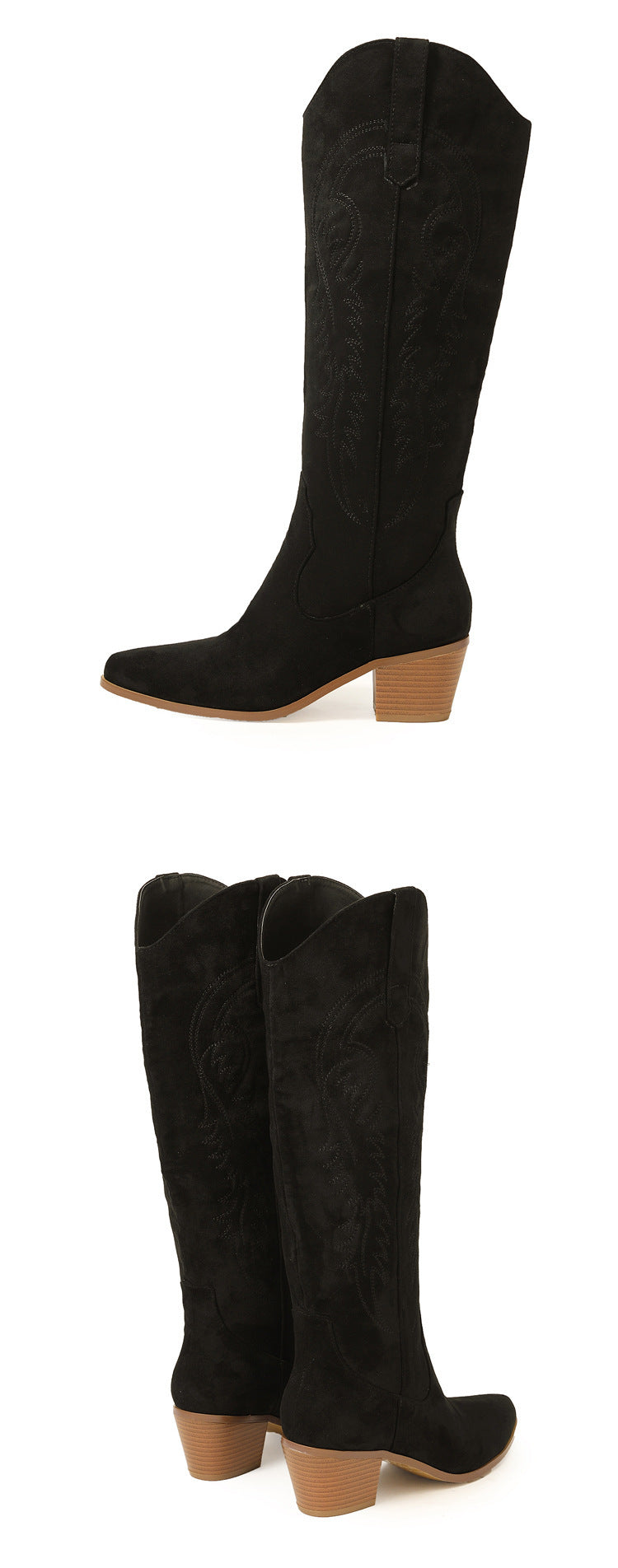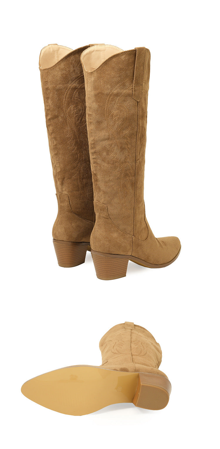 Chunky Heel Knee-high Embroidery Slip-on Middle Boots