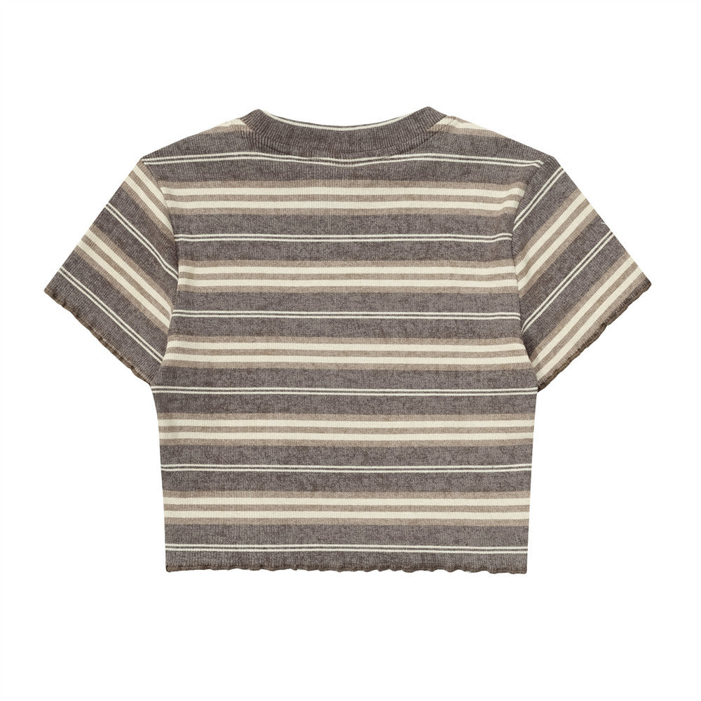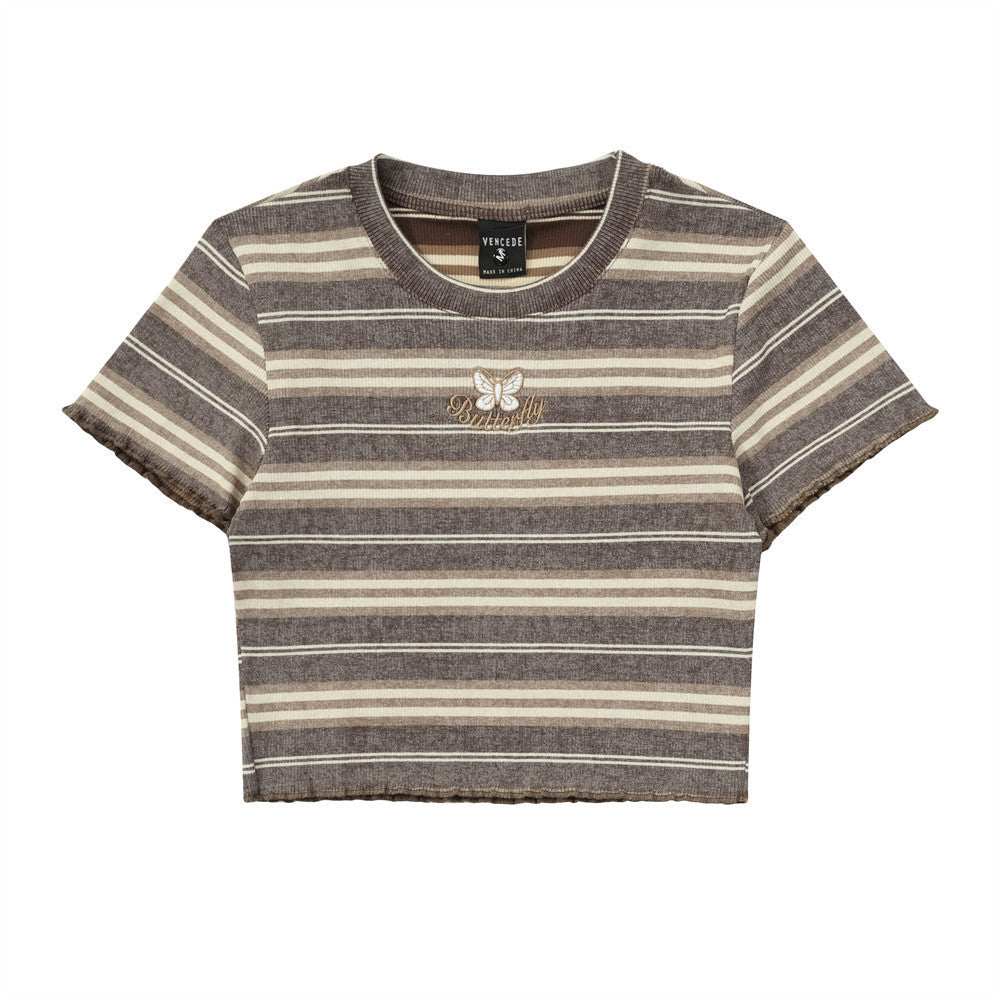 Contrast Color Striped Butterfly Embroidered Short Sleeve