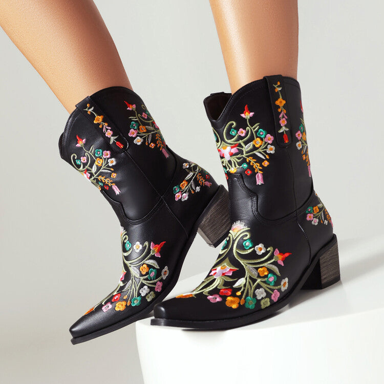 Embroidered Color Matching Ethnic Style Retro Chunky Heel Square Head Knight Martin Boots