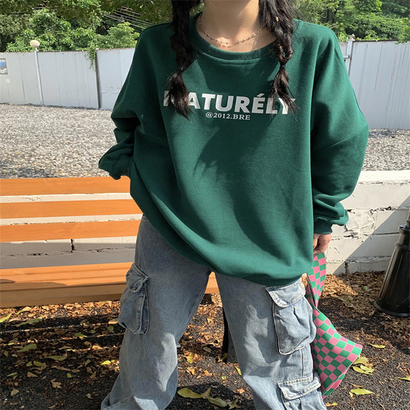 Fleece-lined Letter Print Neck Loose Long Sleeves Sweater
