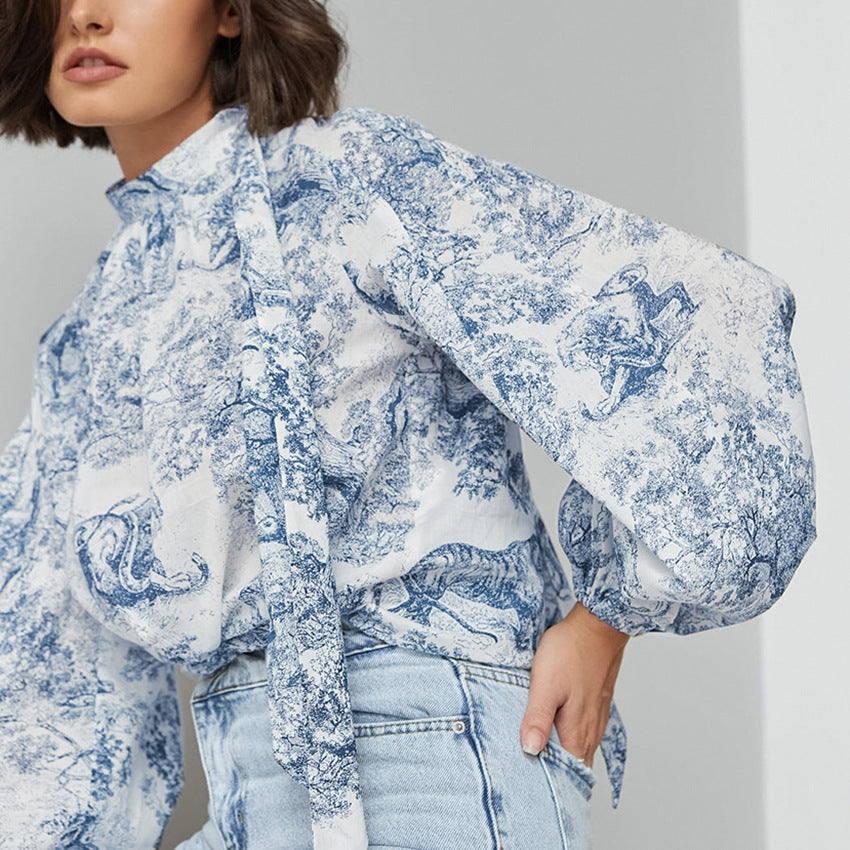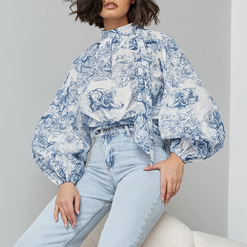 Ink Painting Shirt Design Print Lantern Sleeve Stand Collar Top