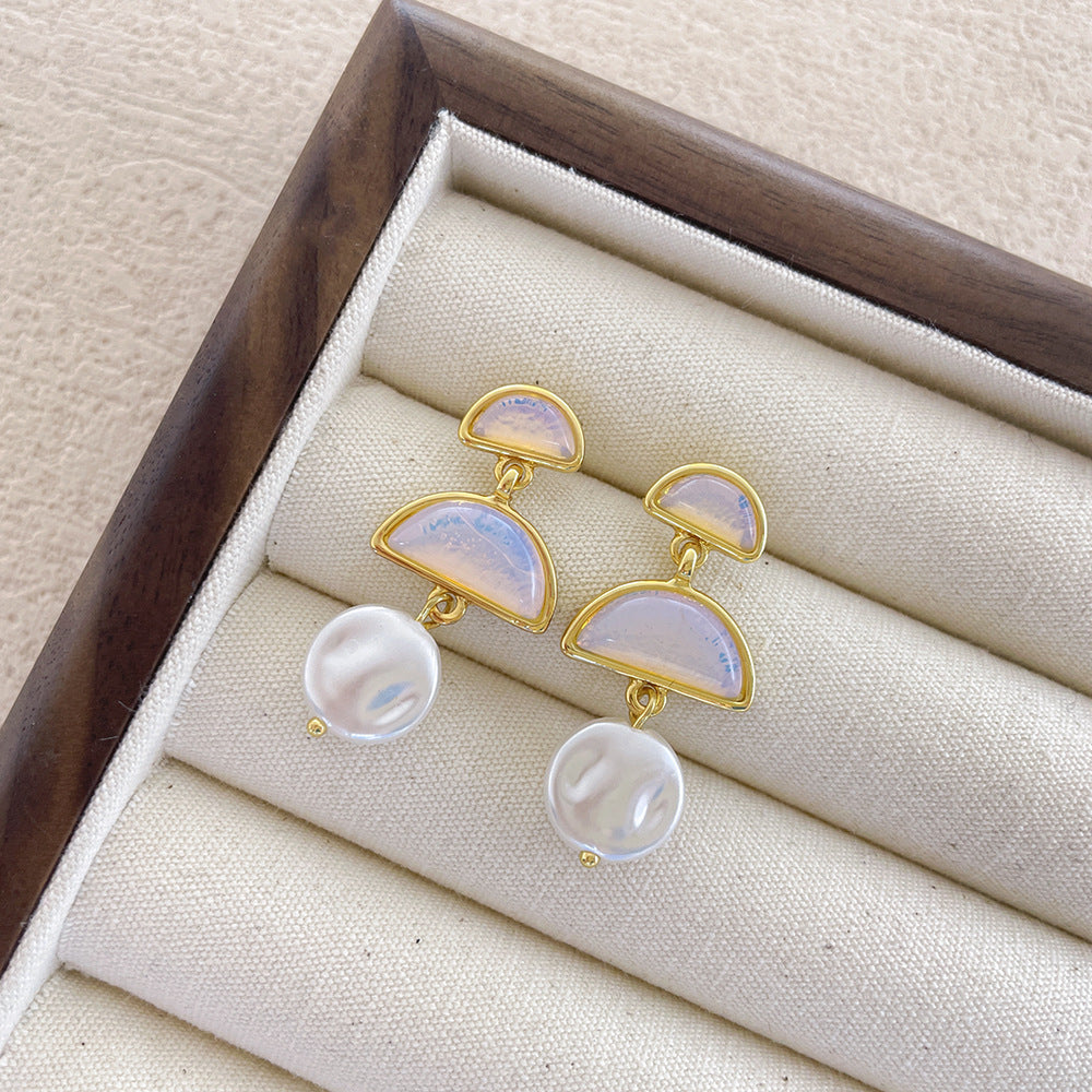 Natural Stone 925 Silver Pin Earrings Multi-layer Semicircle