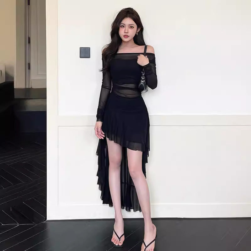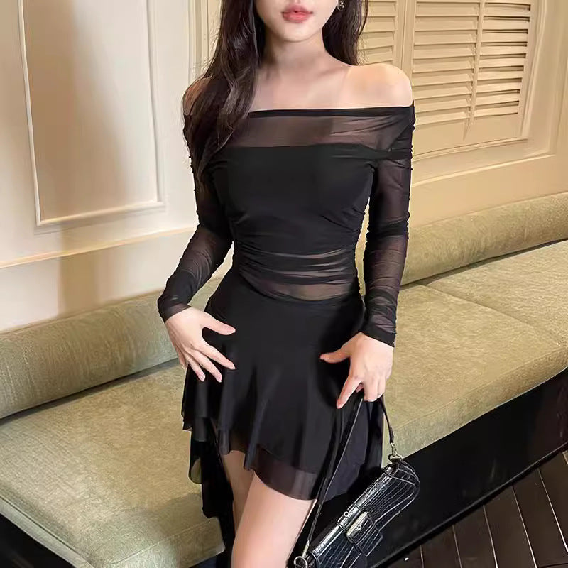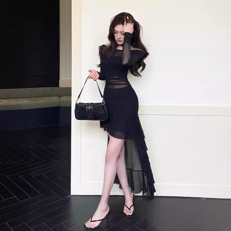 Off-shoulder See-through Irregular Dress French Sweet Vacation Style