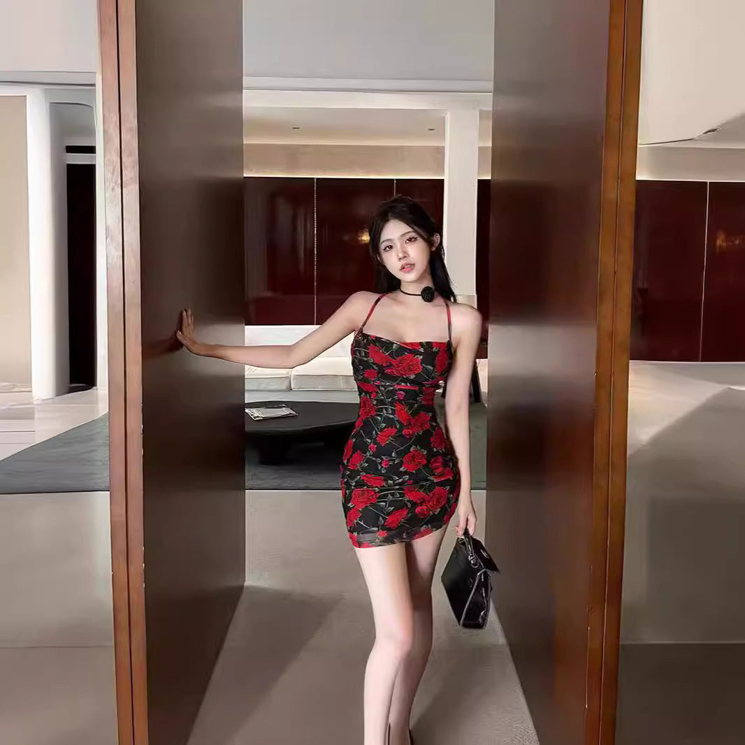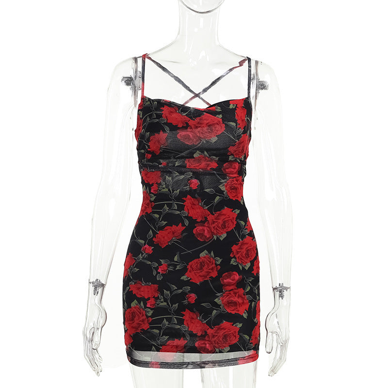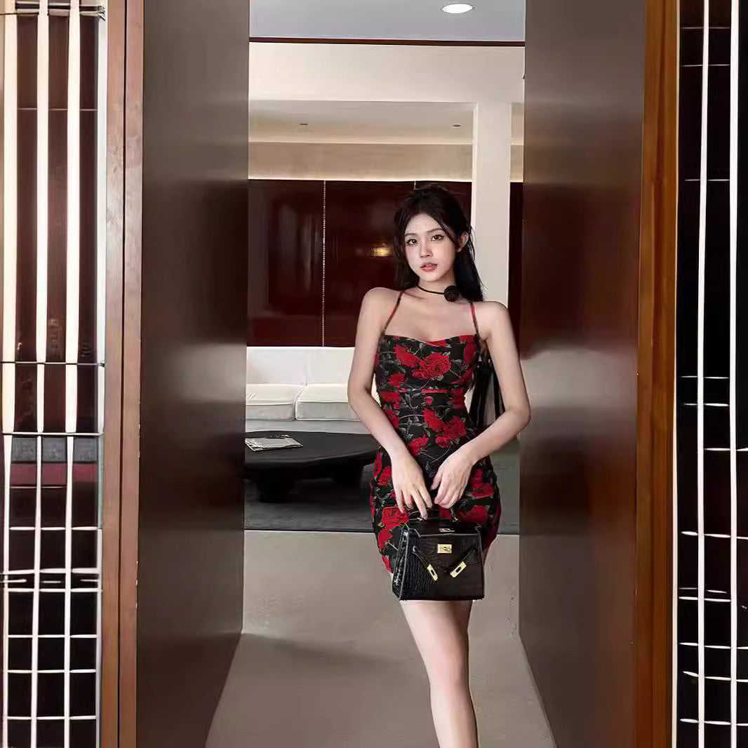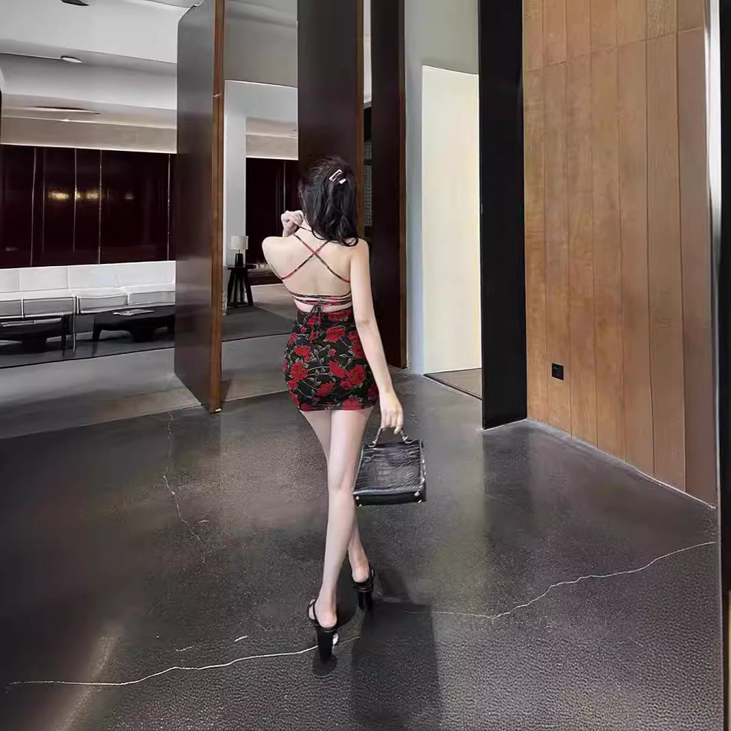 Rose Printing Slip Dress Vacation Style Sexy Backless Hip Skirt