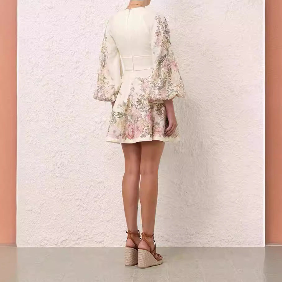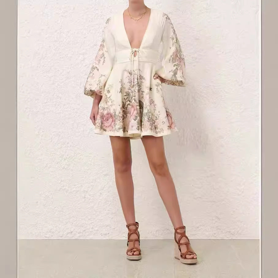 Spring And Summer V-neck Lantern Sleeve Positioning Printing Dress