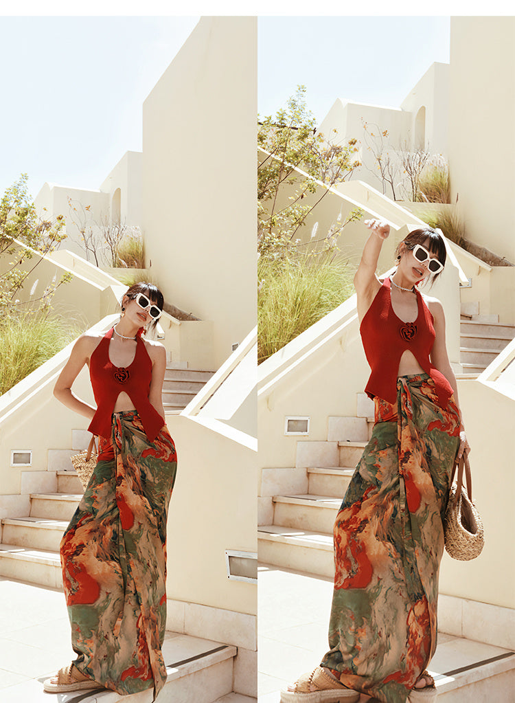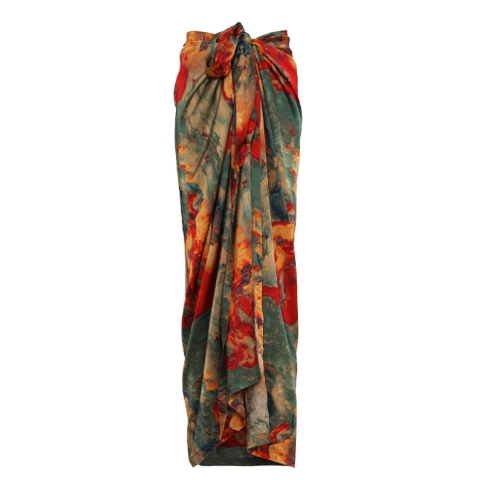 Vacation Style Oil Painting Printed Satin Long Skirt