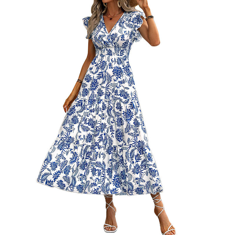 Women's Floral V-shaped Collar Dress Waist Layered Floral Long Skirt